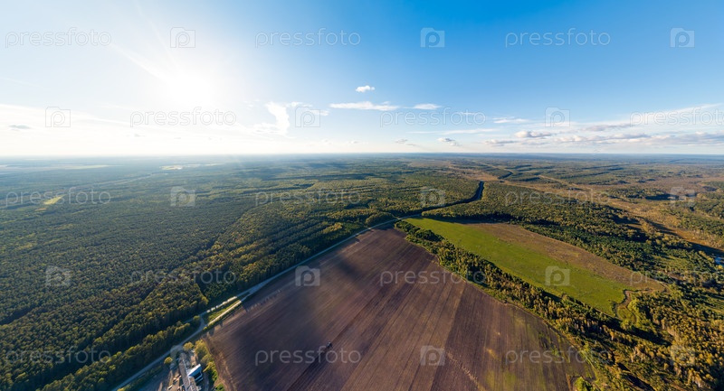 Екатеринбург, Россия.Панорама леса.Конусовый лес.Половое поле.Время захода солнца.Вид с воздуха