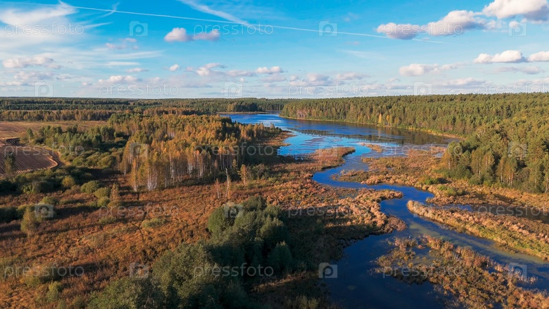 Екатеринбург, Россия. летать над болотистым прудом. кустарник и сосновый лес. ранняя осень. вечернее время