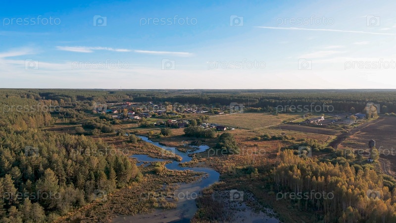 Екатеринбург, Россия.Летите над болотистым прудом.Буш и сосновый лес.Ранняя осень.Вечернее время, вид с воздуха