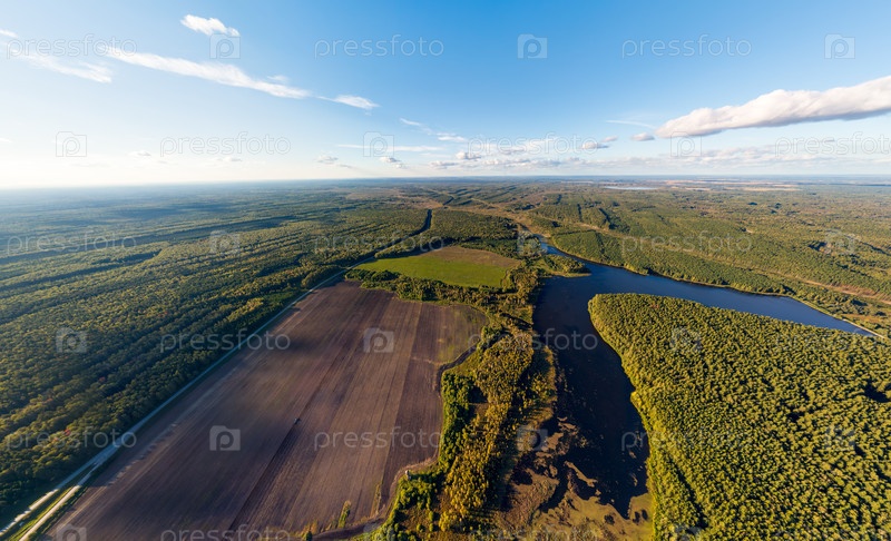 Екатеринбург, Россия.Панорама леса.Конусовый лес.Половое поле.Озеро с болотистой рекой.Вид с воздуха
