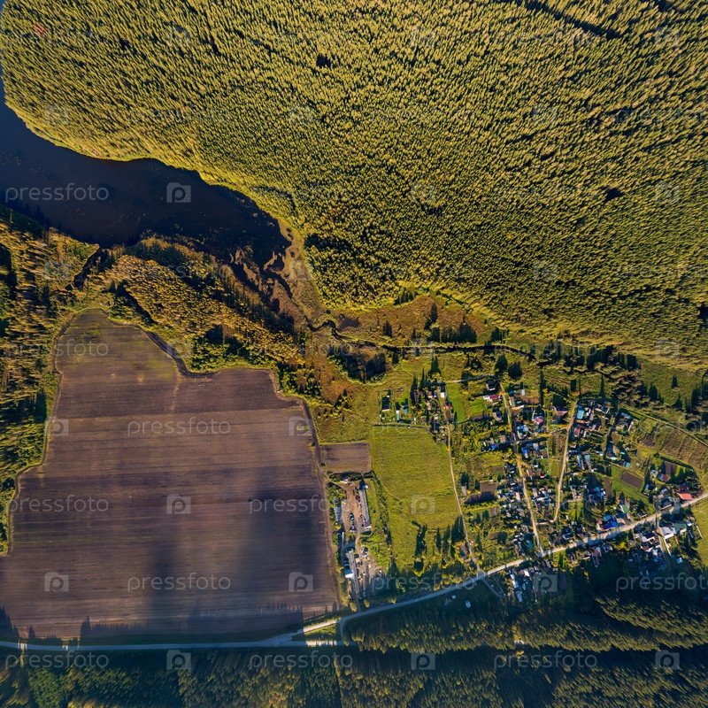 Екатеринбург, Россия. Панорама лесного массива. Хвойный лес. Отраженное поле, деревня и пруд с водно-болотной рекой. Время захода солнца. Вид с воздуха