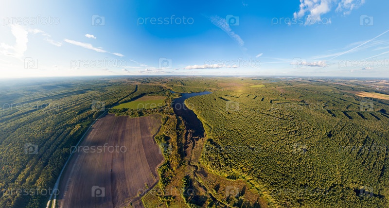 Екатеринбург, Россия.Панорама леса.Конусовый лес.Половое поле.Озеро с болотистой рекой.Время захода солнца.Вид с воздуха