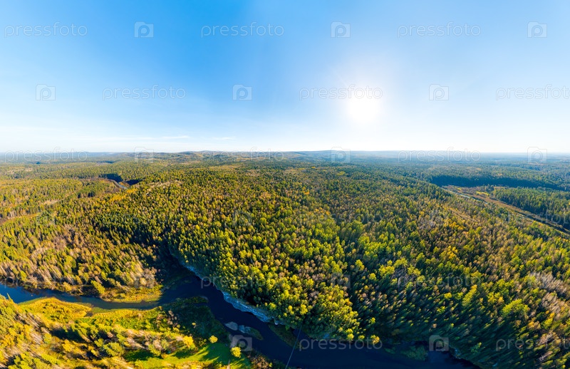 Бажуково, Россия. Каменный Карстовский мост. Река Серга. Осенний пейзаж. Оленьи ручьи. Природный парк в лесистой местности, известной богатой флорой. Вид с воздуха