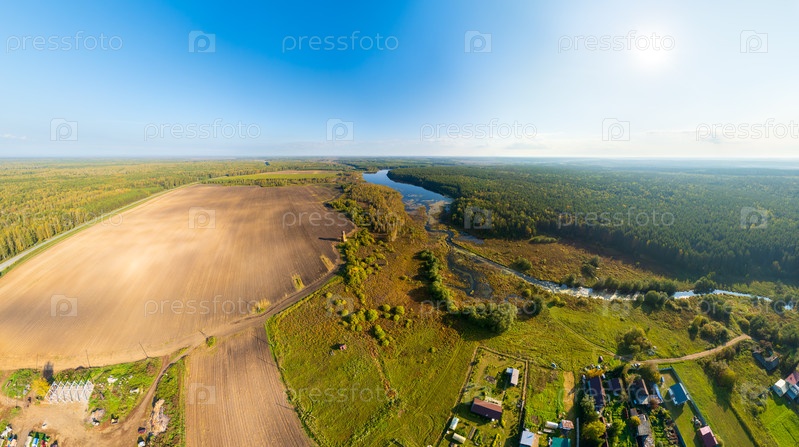 Екатеринбург, Россия. Панорама лесного массива. Хвойный лес. Отраженное поле, деревня и пруд с водно-болотной рекой. Время захода солнца. Вид с воздуха