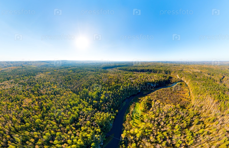 Бажуково, Россия. Каменный Карстовский мост. Река Серга. Осенний пейзаж. Оленьи ручьи. Природный парк в лесистой местности, известной богатой флорой. Вид с воздуха