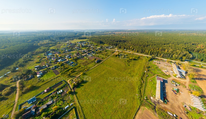 Екатеринбург, Россия. Хвойный лес. Отраженное поле, деревня с болотистой рекой. Панорама леса. Время захода солнца. Вид с воздуха