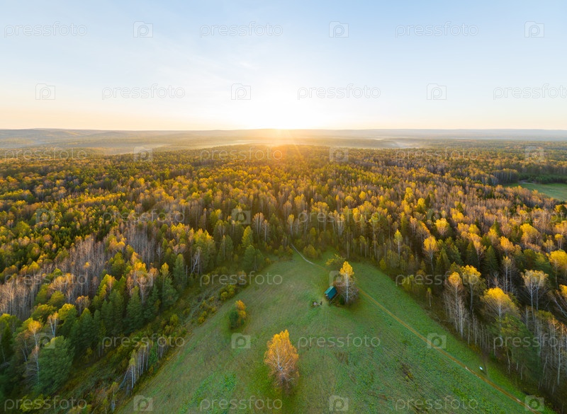 Бажуково, Россия. Восход солнца. Раннее утро. Осенний пейзаж. Серые ручьи. Природный парк в лесистой местности. Вид с воздуха