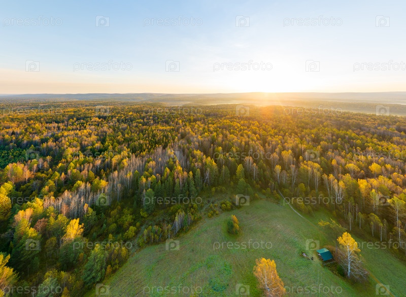 Бажуково, Россия. Восход солнца. Раннее утро. Осенний пейзаж. Серые ручьи. Природный парк в лесистой местности. Вид с воздуха