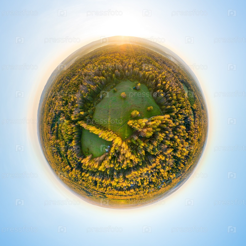 Бажуково, Россия.Солнцестояние.Раннее утро.Осенний пейзаж.Еленские ручьи.Природный парк в лесистой местности.Панорамный астероид на 360 градусов
