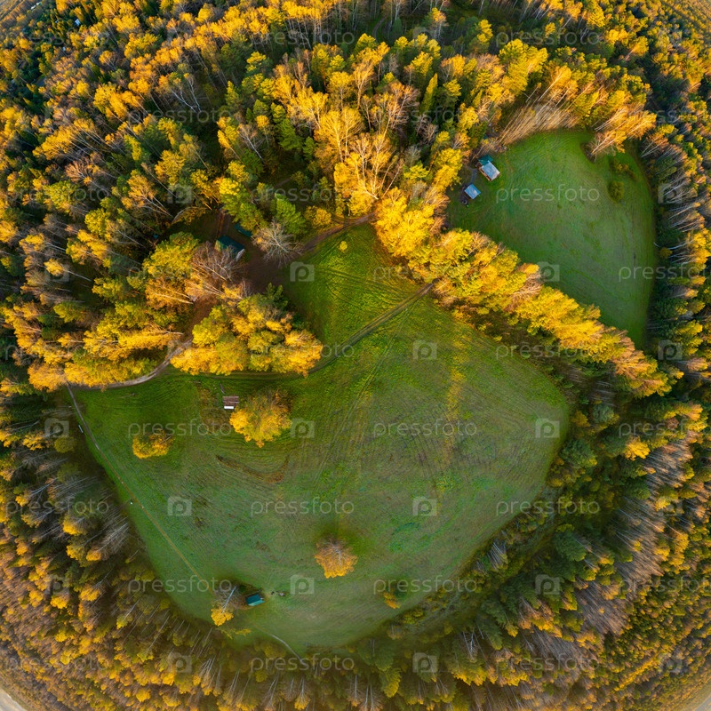 Бажуково, Россия. Восход солнца. Раннее утро. Осенний пейзаж. Серые ручьи. Природный парк в лесистой местности. Вид с воздуха