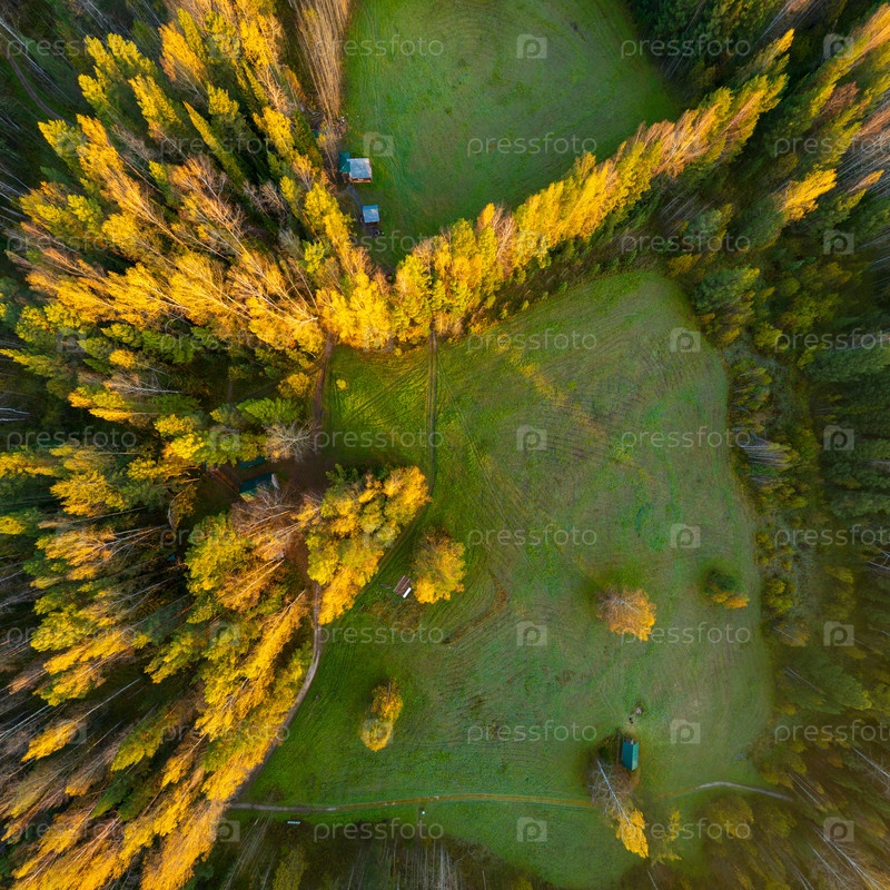 Бажуково, Россия. Восход солнца. Раннее утро. Осенний пейзаж. Серые ручьи. Природный парк в лесистой местности. Вид с воздуха