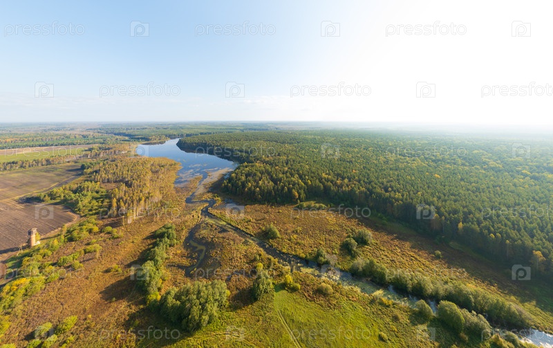 Екатеринбург, Россия. Конусовый лес. Отраженное поле. Водолазный пруд. Панорама леса. Время захода солнца. Вид с воздуха