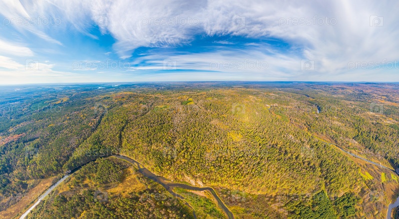 Бажуково, Россия. Легкая скала. Река Серга. Осенний пейзаж. Оленьи ручьи. Природный парк в лесистой местности, известной богатой флорой. Вид с воздуха
