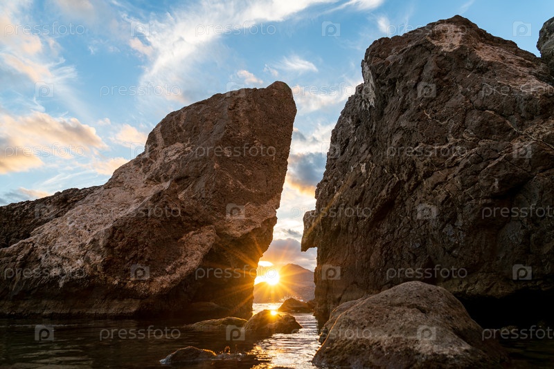 Судак, Крым. Закат над водами Черного моря. Корабль против солнца. Скалы и огни. Контраст и яркое небо с облаками