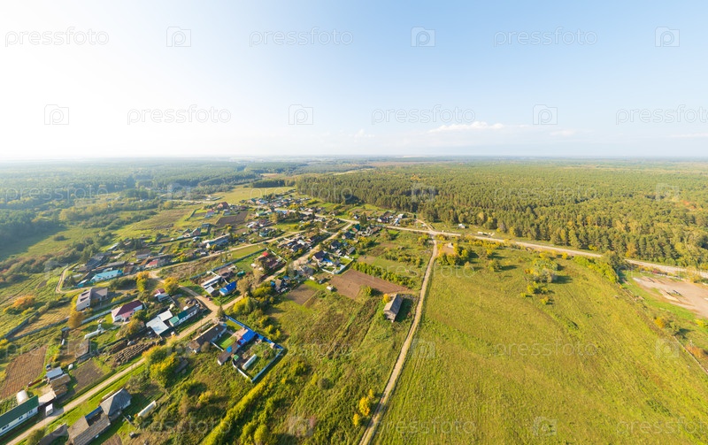 Екатеринбург, Россия. Конусовый лес. Деревня с болотистой рекой. Панорама леса. Время захода солнца. Вид с воздуха