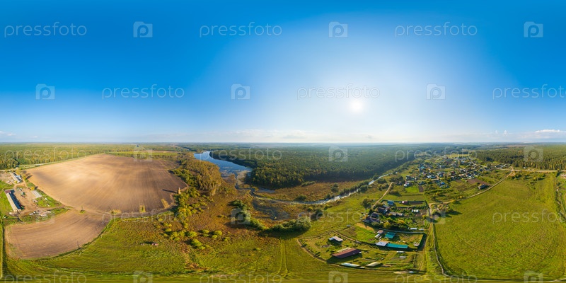 Екатеринбург, Россия. Хвойный лес. Отраженное поле, деревня и пруд с водно-болотной рекой. Панорама леса. Время захода солнца. Панорама 360. Вид с воздуха