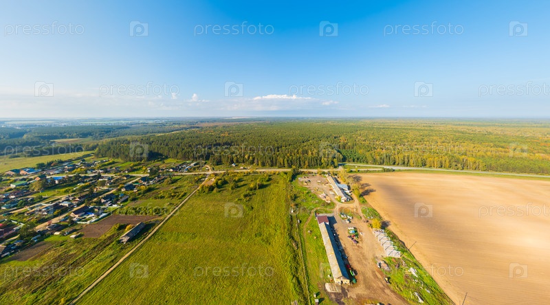 Екатеринбург, Россия. Конусовый лес. Отраженное поле, деревня. Панорама леса. Время захода солнца. Вид с воздуха