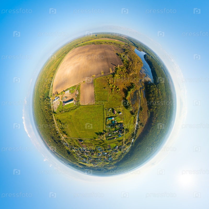 Екатеринбург, Россия. Панорама лесного массива. Хвойный лес. Отраженное поле, деревня и пруд с водно-болотной рекой. Время захода солнца. 360-градусная панорамная астероидная картина
