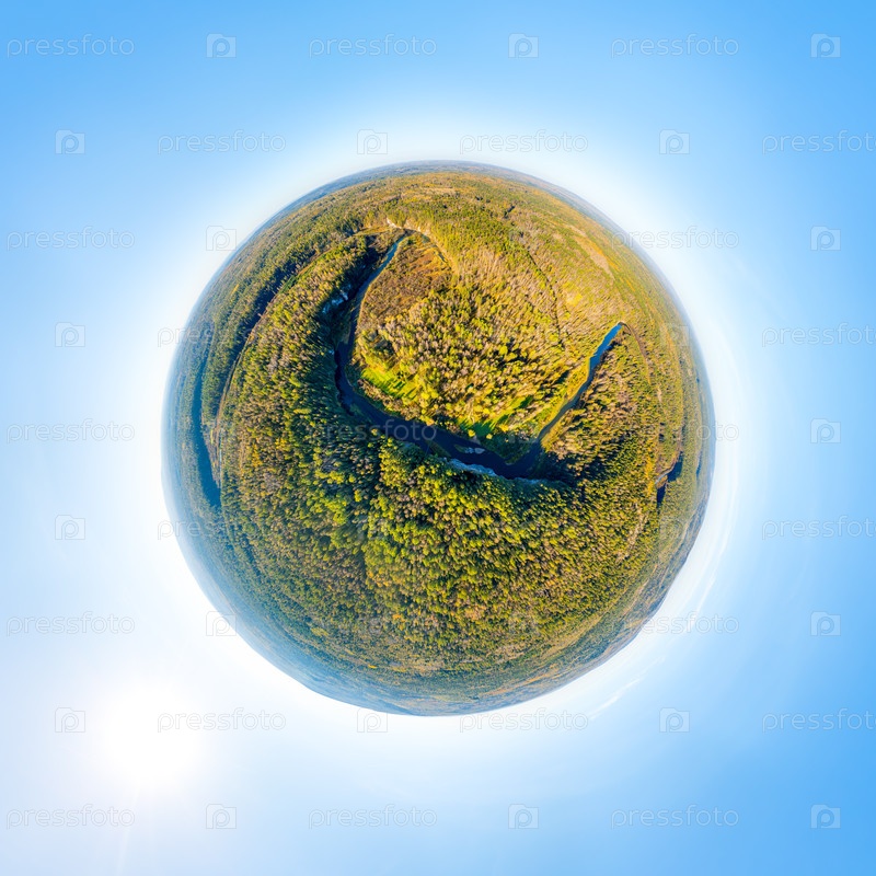 Бажуково, Россия. Каменный Карстовский мост. Река Серга. Осенний пейзаж. Оленьи ручьи. Природный парк в лесистой местности, известной богатой флорой. 360-градусная панорама астероида