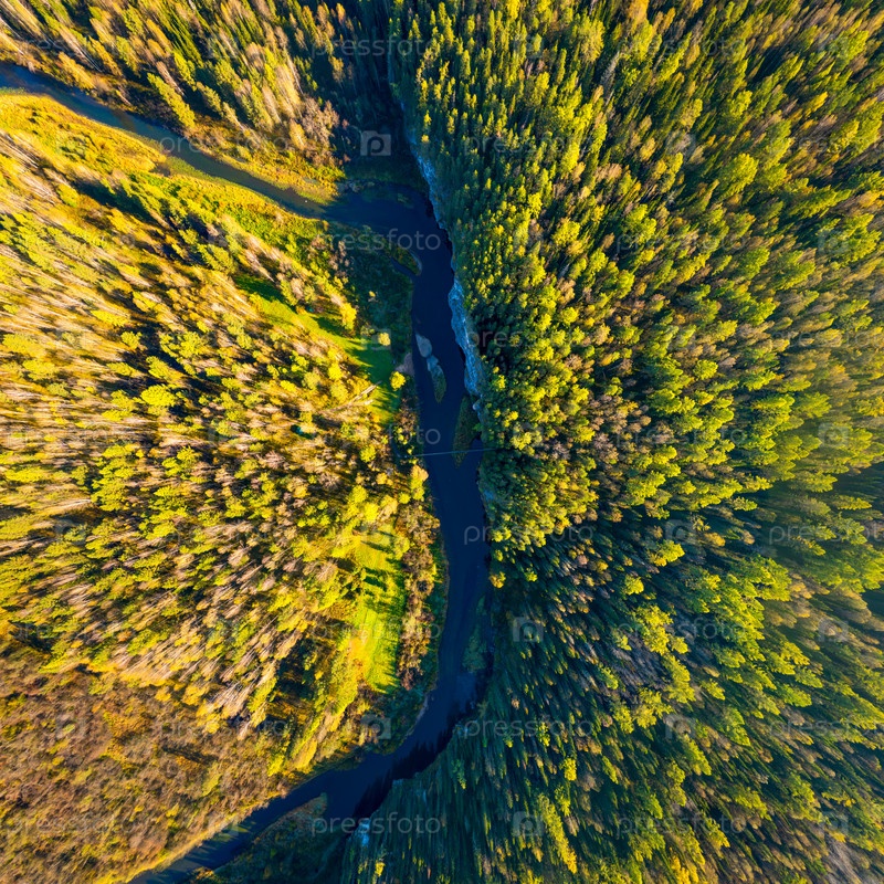 Бажуково, Россия. Каменный Карстовский мост. Река Серга. Осенний пейзаж. Оленьи ручьи. Природный парк в лесистой местности, известной богатой флорой. Вид с воздуха