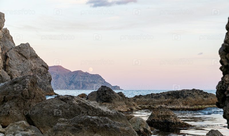 Судак, Крым. Луна восходит. мыс Рыбака. гора Меганом в свете заходящего солнца