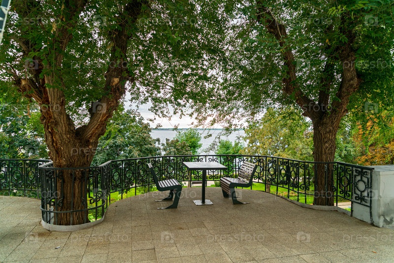 Саратов, Россия. скамейки на шахматных столах. Пристань астронавта. верхний уровень. вид на Волгу
