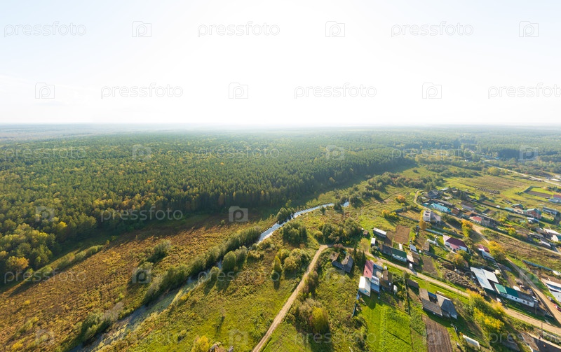 Екатеринбург, Россия. Конусовый лес. Деревня с болотистой рекой. Панорама леса. Время захода солнца. Вид с воздуха