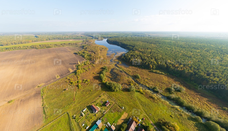Екатеринбург, Россия. Панорама лесного массива. Хвойный лес. Отраженное поле, деревня и пруд с водно-болотной рекой. Время захода солнца. Вид с воздуха