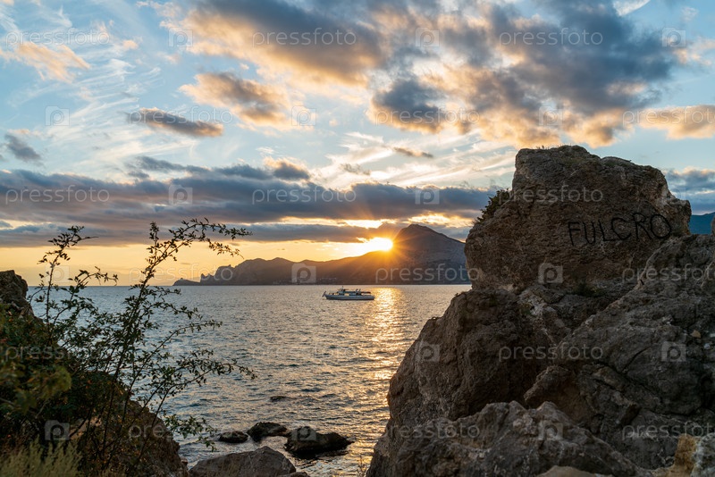 Судак, Крым. Закат над водами Черного моря. Корабль против солнца. Скалы и огни. Контраст и яркое небо с облаками