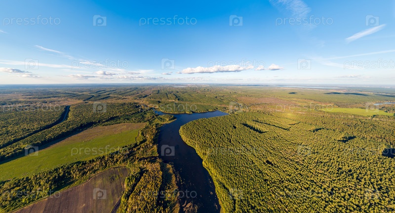Екатеринбург, Россия.Панорама леса.Конусовый лес.Половое поле.Озеро с болотистой рекой.Время захода солнца.Вид с воздуха