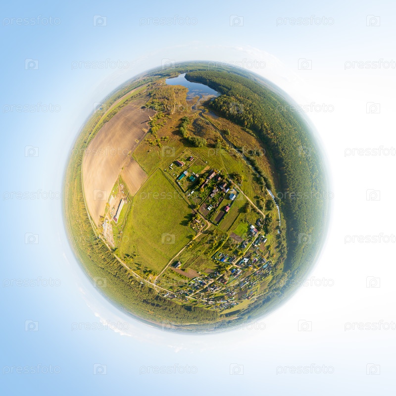 Екатеринбург, Россия. Панорама лесного массива. Хвойный лес. Отраженное поле, деревня и пруд с водно-болотной рекой. Время захода солнца. 360-градусная панорамная астероидная картина