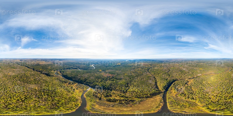 Бажуково, Россия. Осенний пейзаж. Река Серга. Оленьи ручьи. Природный парк в лесистой местности, известной богатой флорой. Панорама 360 x 180. Вид с воздуха