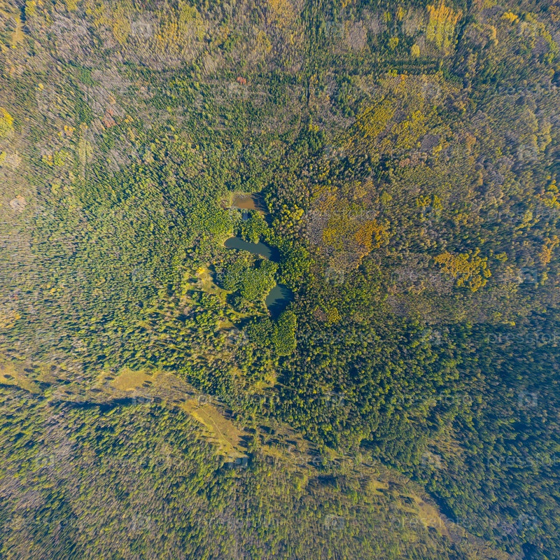 Бажуково, Россия. Миткинские озера (мины). Осенний пейзаж. Серые ручьи. Природный парк в лесистой местности, известной богатой флорой. Вид с воздуха