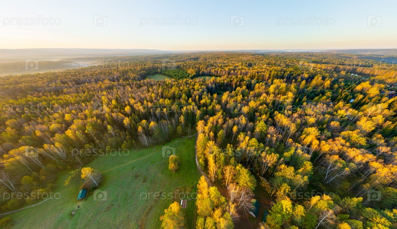 Бажуково, Россия. Восход солнца. Раннее утро. Осенний пейзаж. Серые ручьи. Природный парк в лесистой местности. Вид с воздуха