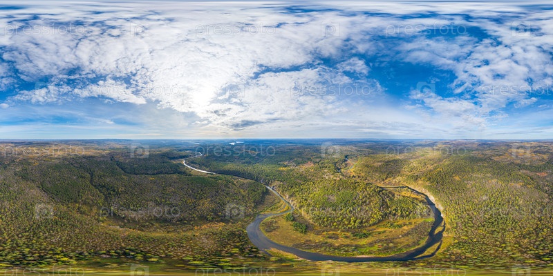 Бажуково, Россия. Осенний пейзаж. Река Серга. Оленьи ручьи. Природный парк в лесистой местности, известной богатой флорой. Панорама 360 x 180. Вид с воздуха