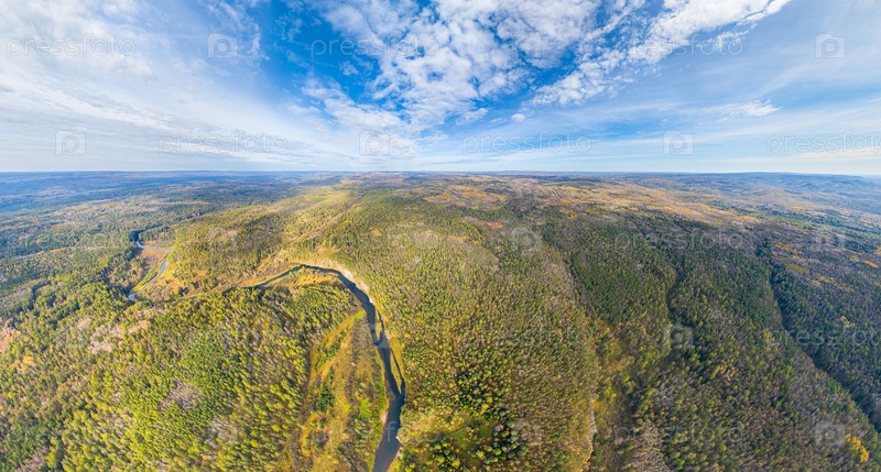 Бажуково, Россия. Осенний ландшафт. Река Серга. Оленьи ручьи. Природный парк в лесистой местности, известной богатой флорой. Вид с воздуха