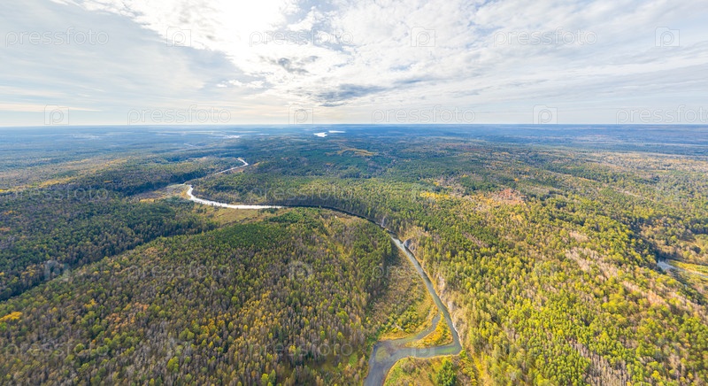 Бажуково, Россия. Осенний ландшафт. Река Серга. Оленьи ручьи. Природный парк в лесистой местности, известной богатой флорой. Вид с воздуха