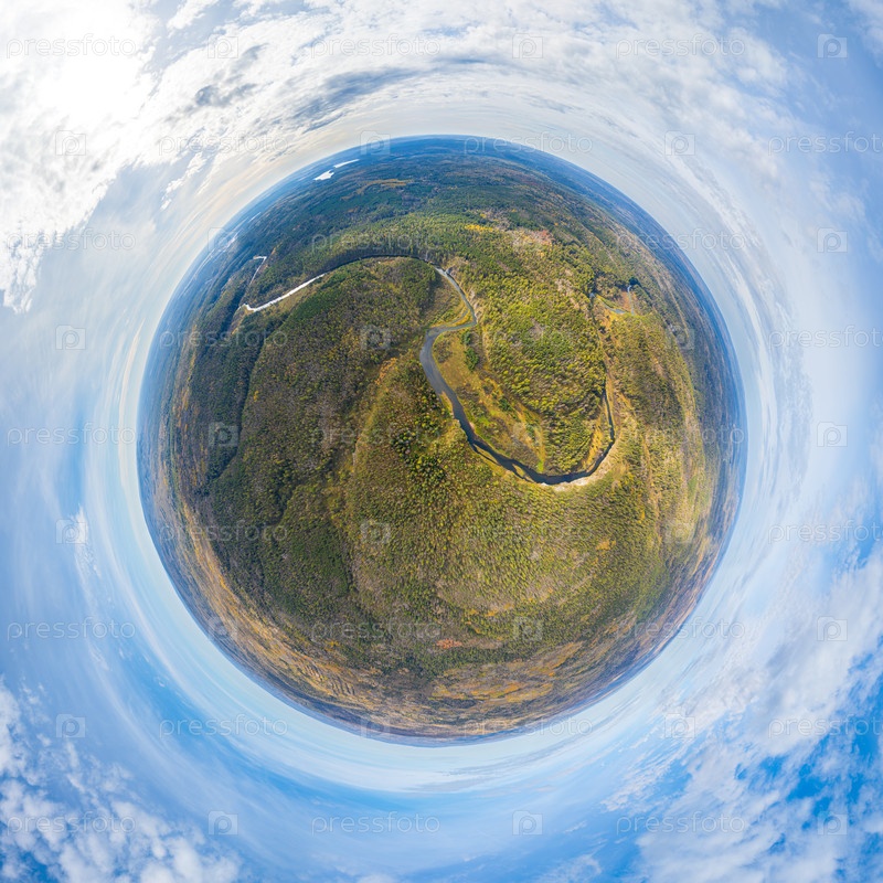 Бажуково, Россия. Осенний пейзаж. Река Серга. Оленьи ручьи. Природный парк в лесистой местности, известной богатой флорой. 360-градусная панорама астероида