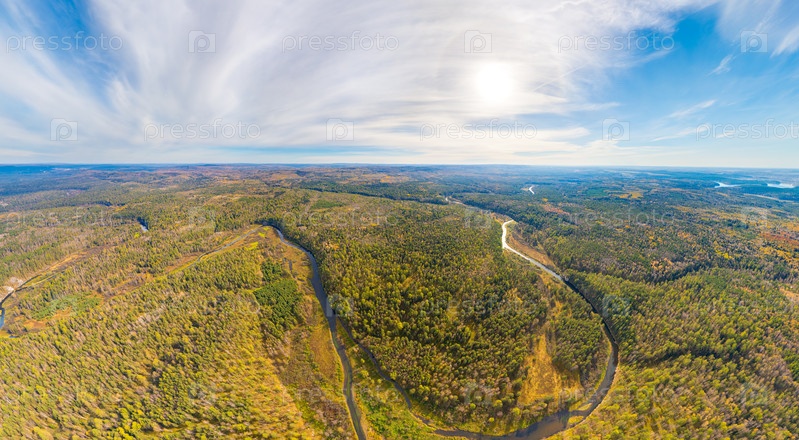 Бажуково, Россия. Легкая скала. Река Серга. Осенний пейзаж. Оленьи ручьи. Природный парк в лесистой местности, известной богатой флорой. Вид с воздуха