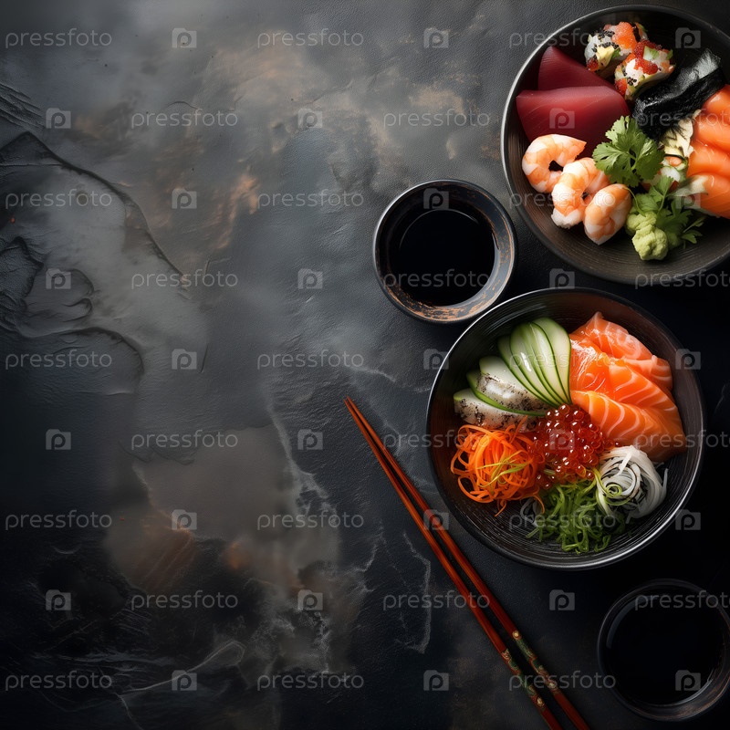 Японская кухня в керамических мисках с соевым соусом на темном фоне