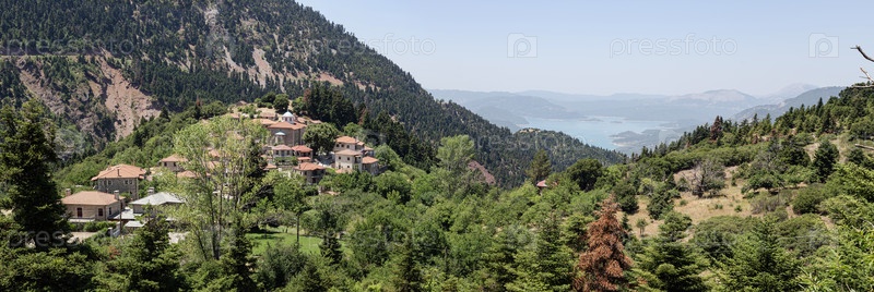 Небольшая деревня Фидакия (Евретания, центральная Греция) с традиционными каменными домами в летний день