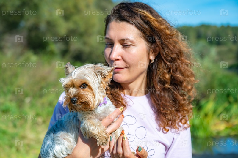 Женщина держит маленькую собаку на улице под теплым солнцем