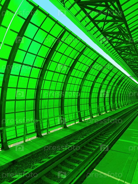 Железнодорожный вокзал с прозрачными стенами зеленого оттенка