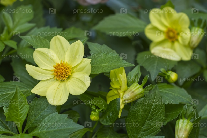 Цветок желтой далии с зелеными листьями в саду