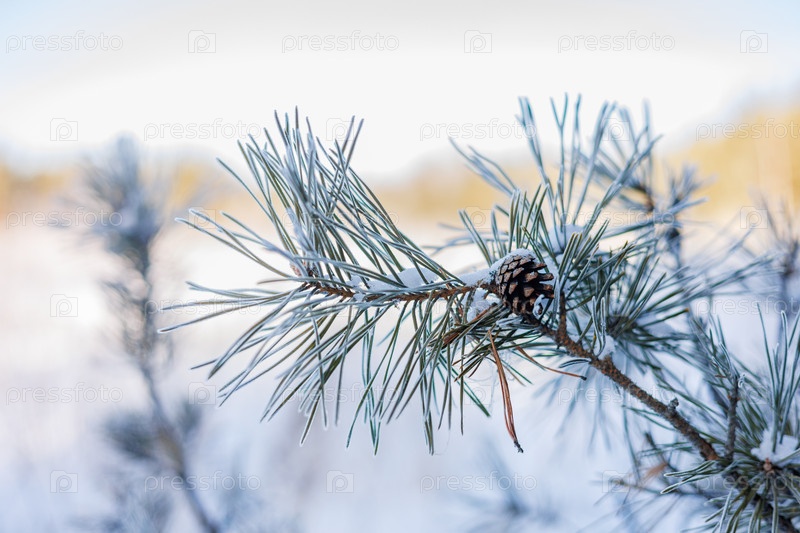 Заснеженная сосновая ветвь с конусом