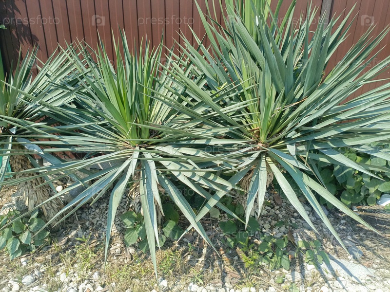 Три растения юкки в современном садовом стиле в зеленом и белом цветах, представляющие собой пустынный ландшафтный дизайн и засухоустойчивое садоводство