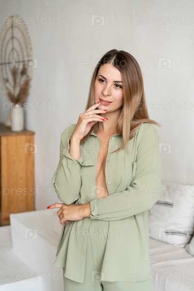 Красивая молодая женщина позирует в зеленой рубашке в студии