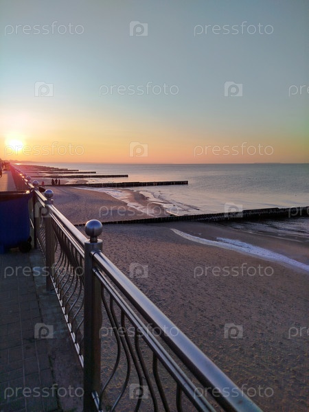 Закат солнца над набережной Балтийского моря с пляжем и водохранилищами