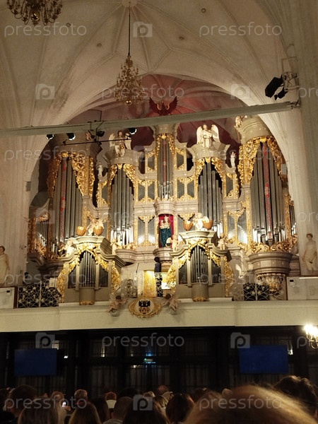 Величественный орган в церкви с золотыми резьбами. собор Калининграда