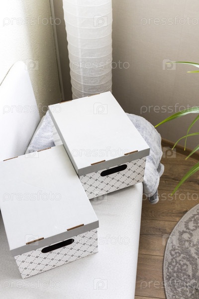 Картонные коробки складываются на диване в уютной комнате